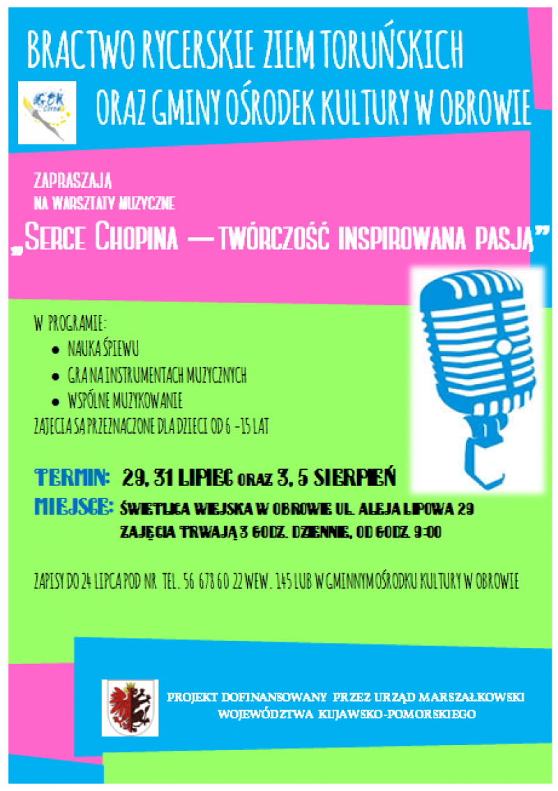 W lipcu i sierpniu w Świetlicy Wiejskiej w Obrowie w ramach projektu pn. „Serce Chopina – Twórczość inspirowana pasją” zostały zrealizowane warsztaty wokalno - instrumentalne oraz warsztaty kreatywne dla dzieci z gminy Obrowo. Dzieci miały możliwość gry na instrumentach, nauki śpiewu oraz zdobienia pudełek metoda decoupage czy też ozdabiania ramek z odlewów gipsowych. Organizatorem projektu było bractwo Rycerskie Ziem Toruńskich z Brzozówki oraz współorganizator Gminny Ośrodek Kultury w Obrowie. Projekt został dofinansowany przez Urząd Marszałkowski Województwa Kujawsko – Pomorskiego w ramach działania 413 „Wdrażanie lokalnych strategii rozwoju” objętego PROW na lata 2007-2013.